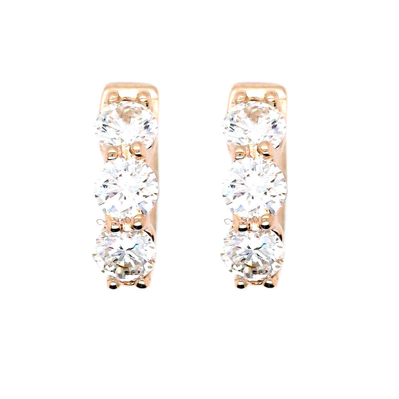 This pair of 14K yellow gold diamond hoop earrings features six round brilliant diamonds set along the front of the earrings. The total diamond weight of the pair is 1.29 carats.