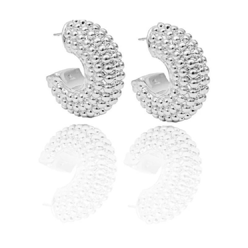 Bold Sterling Silver hoop earrings with a textured design offer a luxurious look at a more affordable price. The raised design adds dimension and style, making them perfect for both casual and formal occasions. These Medium to large-sized hoops are versatile and elegant.