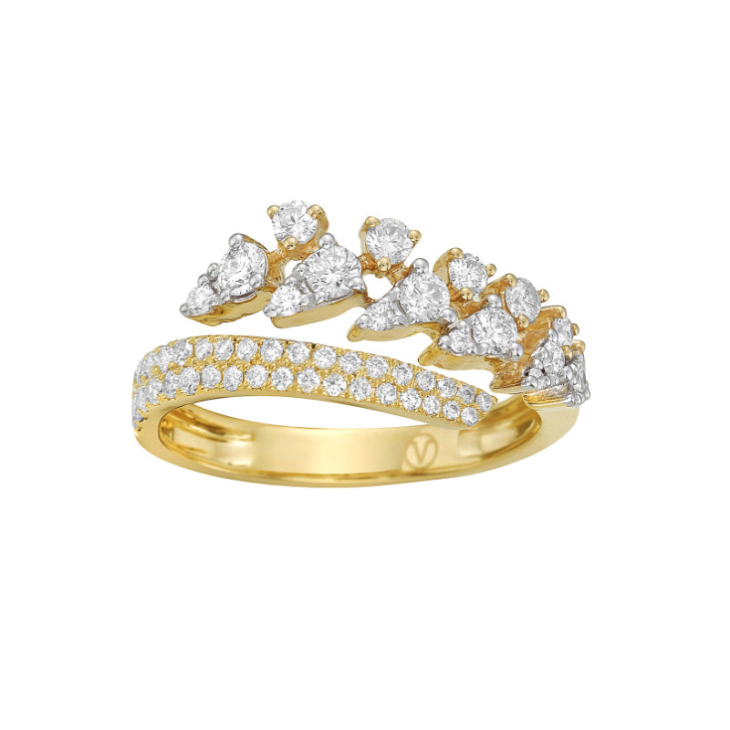 This 14K yellow gold diamond ring features an open bypass design with prong set diamonds set along one side, and a double row of pavé set diamonds along the other. The total diamond weight of the ring is .64 carat.