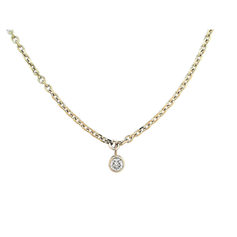 This 14K yellow gold diamond necklace features one .18ct bezel set diamond dangle suspended from the center of a 16 inch 2.1 mm diamond cut cable chain.
